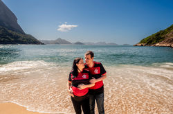 Um dia de sol na Praia Vermelha, o mar calmo ao fundo e uma família cheia de amor à espera de um novo capítulo de suas vidas.